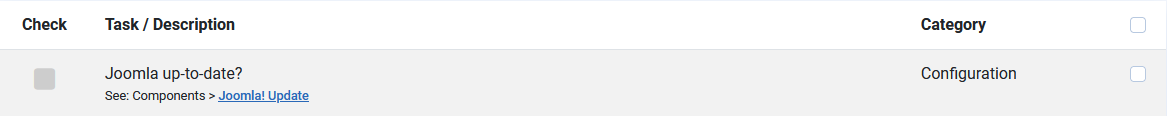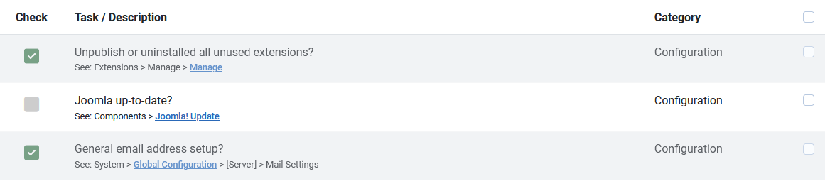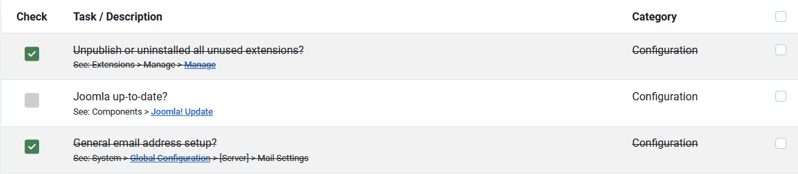 In your Joomla administrator dashboard you will find a module with a list of categories and an overview of your checked and unchecked tasks.