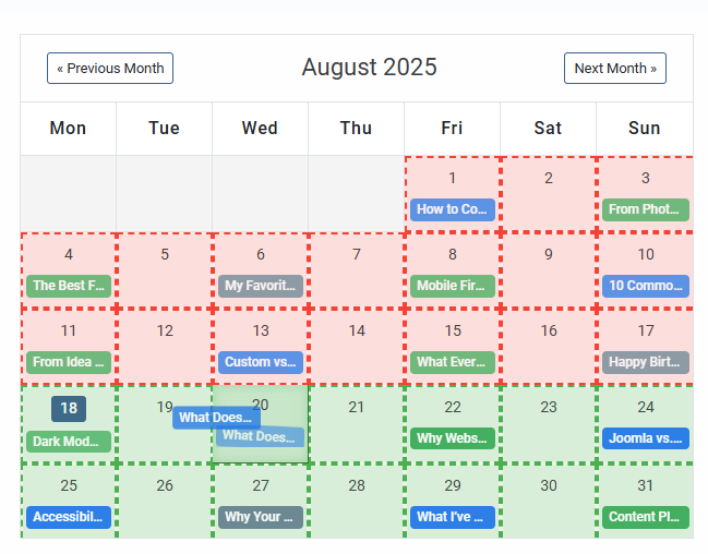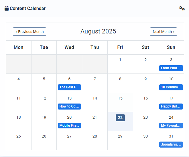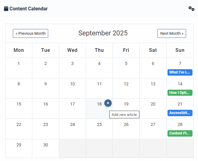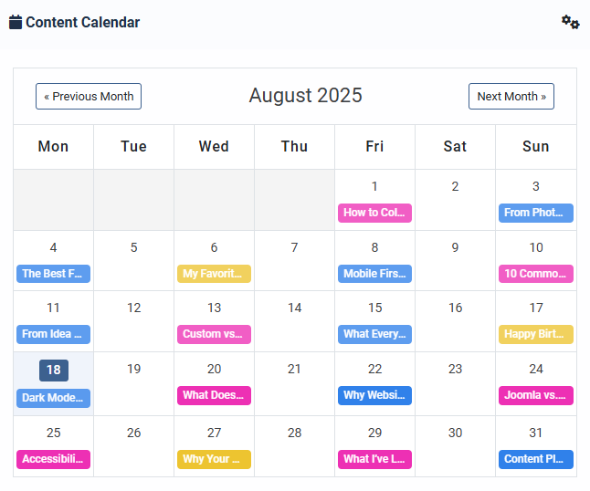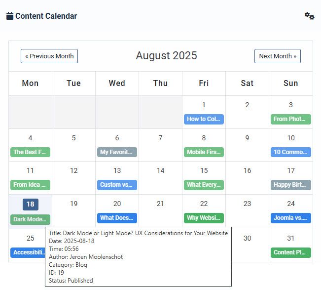 The PRO version takes the module to the next level. With drag-and-drop functionality you can easily reschedule articles, while the option to add new articles directly makes your workflow even faster. Custom colors help you distinguish categories, tags or authors at a glance, and the clear week view gives you better insights into your content planning, so you stay in control of what goes live and when.